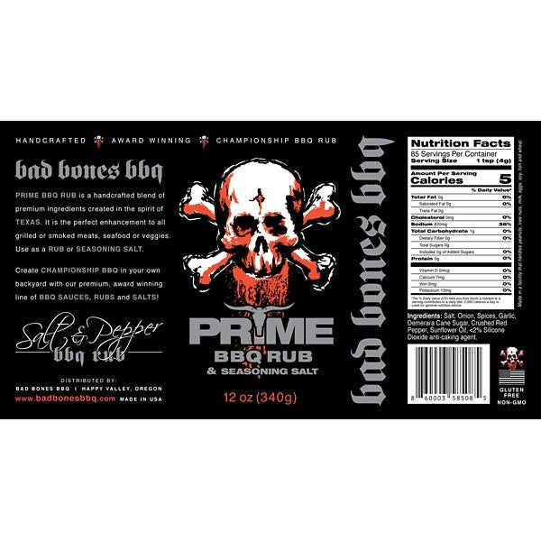 Elevate your grilling game with BAD BONES BBQ Prime BBQ Rub & Seasoning. Crafted in the spirit of Texas, this premium blend enhances the flavor of meats, seafood, and veggies. Ideal for both grilling and smoking, it's a must-have for any BBQ enthusiast.