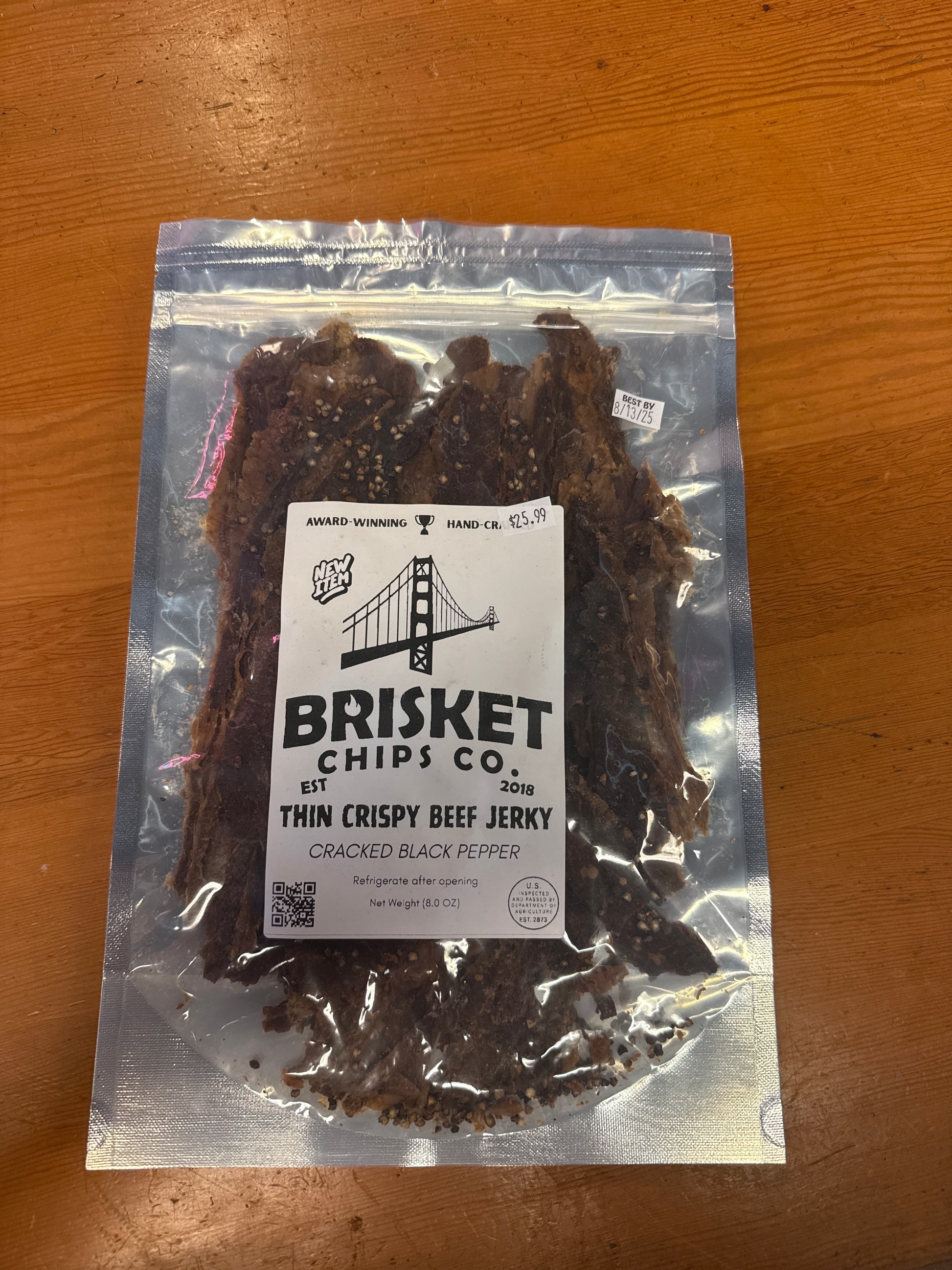 Brisket Chips Co.'s Thin Crispy Beef Jerky offers an award-winning, hand-crafted snack seasoned with cracked black pepper for a bold flavor. Established in 2018, this crispy treat is perfect for beef jerky enthusiasts looking for a savory and satisfying bite. Each package contains 8.0 oz of premium quality jerky.