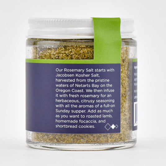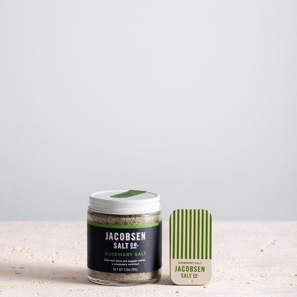 Enhance your culinary creations with Jacobsen Salt Co.'s Rosemary Salt. This 3.5 oz jar of artisan sea salt is infused with aromatic rosemary, ideal for seasoning meats, vegetables, and more. Elevate your dishes with this flavorful, gourmet touch.